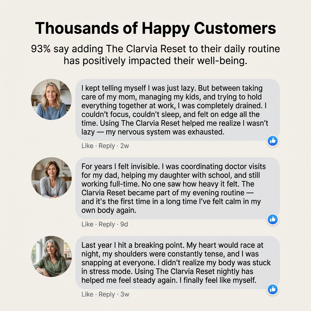 The Clarvia Reset is designed to support your nervous system after prolonged stress. When your body stays in a constant state of alert, exhaustion and tension can become your normal. With consistent use, it helps support a gradual shift out of chronic stress patterns.